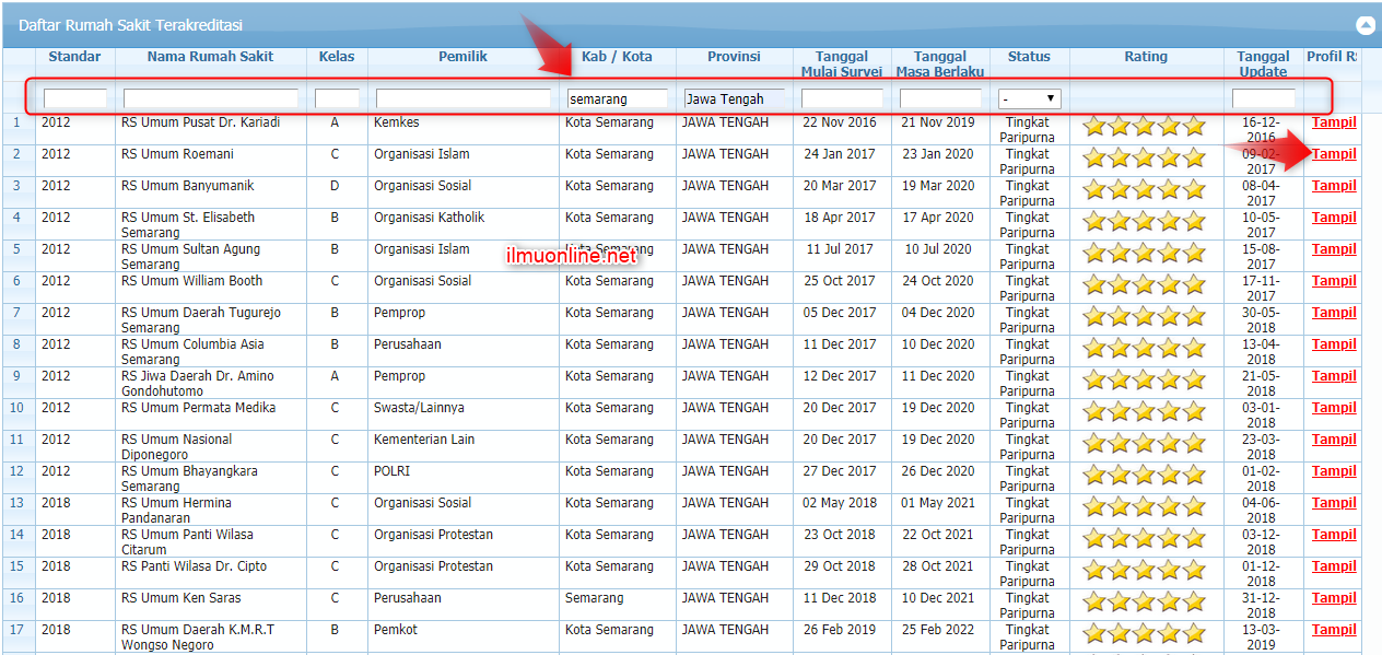 - Dalam halaman tersebut sudah tampil daftar akreditasi rumah sakit, anda tinggal mencari rumah sakit tujuan. Apakah ingin mencari berdasarkan nama rumah sakit, lokasi kota /kabupaten, kelas akreditasi, dan lain sebagainya, anda tinggal mensortir sesuai kebutuhan ya.