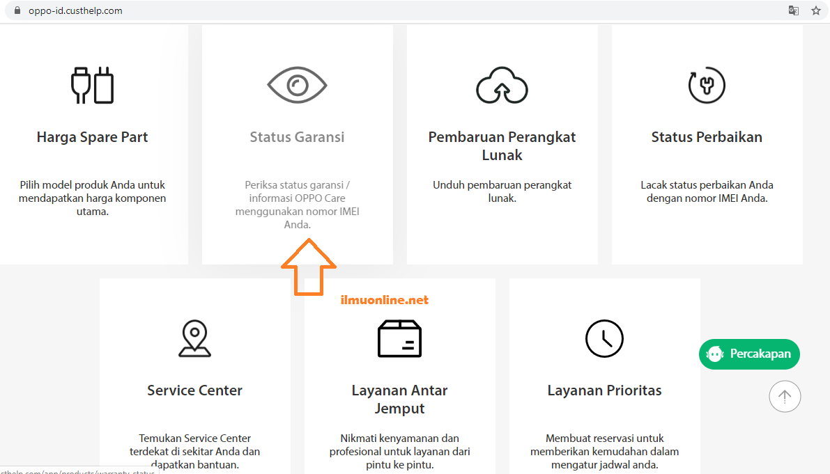 Langkah selanjutnya yaitu buka link https://oppo-id.custhelp.com/ pada browser, bisa di laptop, bisa juga di smartphone. Kemudian kamu akan diarahkan ke halaman dengan tampilan seperti gambar berikut. Disana terdapat beberapa layanan yang disediakan oleh Oppo. Nah, karena kita akan mengecek garansi, maka menu yang kita pilih Status Garansi.