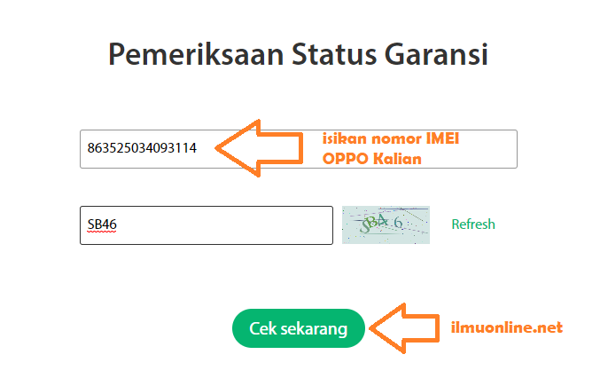 Selanjutnya akan muncul halaman seperti berikut ini. Isi kolom nomor IMEI dengan nomor yang sudah kita cari sebelumnya. Pastikan nomor yang kamu masukkan benar ya guys. Masukkan juga kode validasi sesuai yang tertera pada halaman tersebut. Kemudian klik Cek Sekarang.