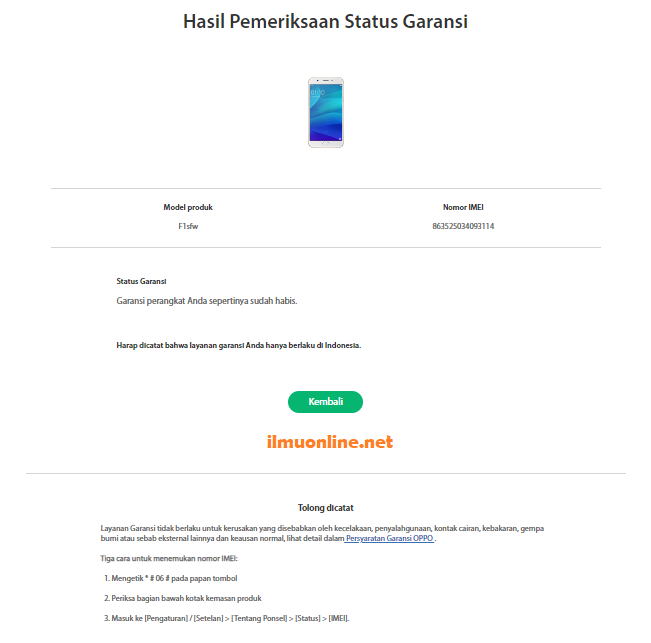 Lalu, akan muncul segala informasi tentang ponsel Oppo tersebut. Disana juga terdapat informasi mengenai status garansi, Asuransi dan model smartphone. Jika garansi masih berlaku, disana akan tertulis jangka waktu garansi. Masa berlaku garansi ini tidak bisa dimanipulasi sehingga kamu akan dengan mudah membedakan ponsel yang masih benar-benar memiliki garansi dengan ponsel yang garansinya sudah habis.