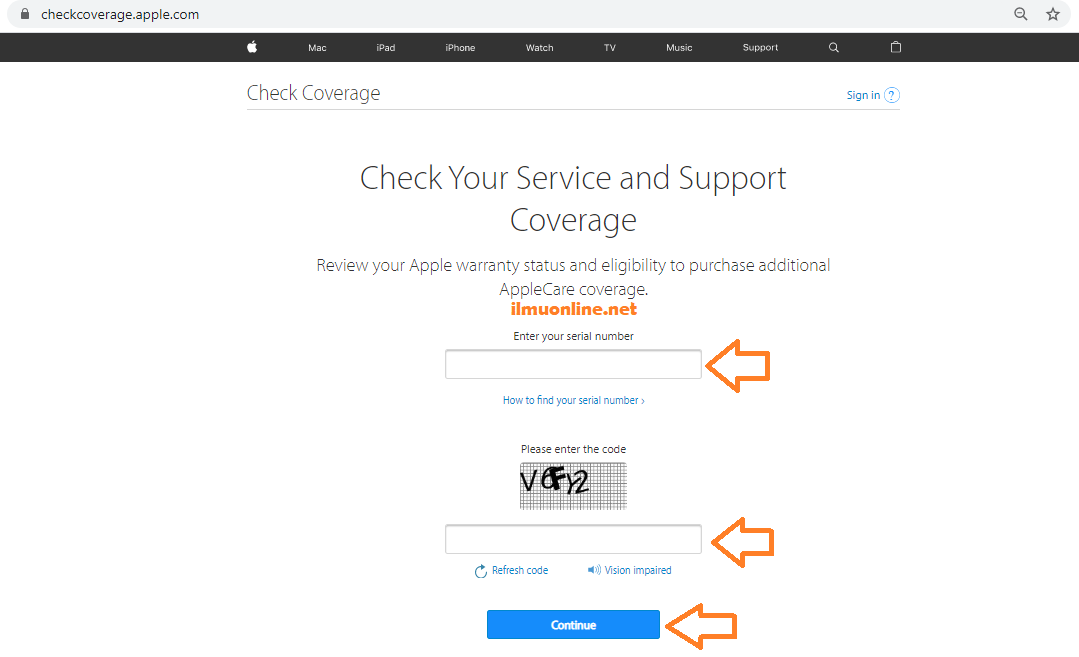 - Untuk mengeceknya anda bisa memasukkan serial number iphone yang anda miliki di form yang sudah disediakan, dan pada bagian please enter code isikan sesuai yang tampil dilayar pada website resminya.