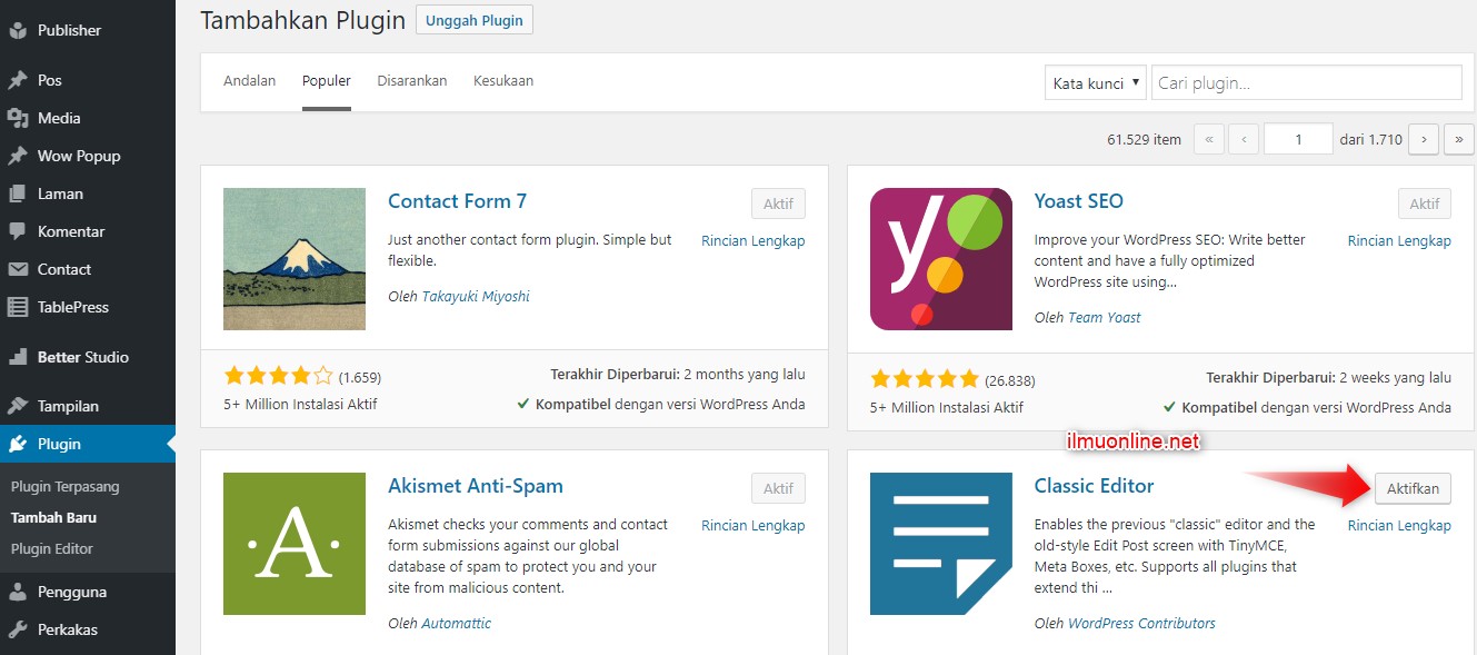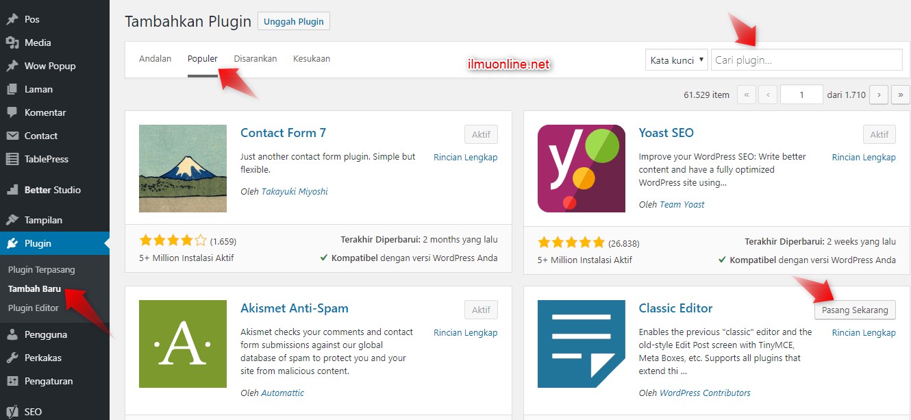 Plugin populer seperti Yoast SEO, Contact Form 7, Akismet Anti-Spam, Classic Editor, Really Simple SSL, dan plugin lainnya bisa anda instal di website yang anda kelola. Adapun cara install plugin wordpress bisa anda ikuti step by stepnya pada penjelasan berikut ini.