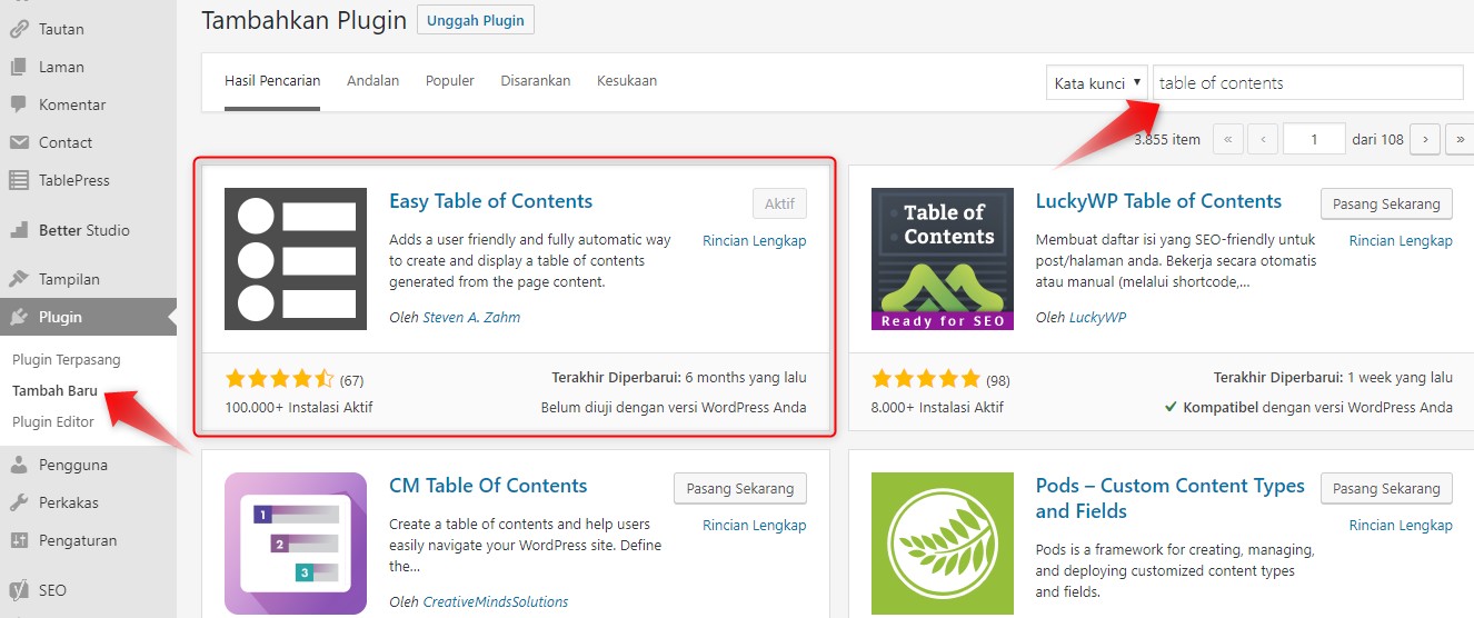 - Ada banyak plugin sejenis yang bisa anda pilih, namun kalau saya menggunakan Plugin Easy Table of Contents oleh Steven A. Sham.