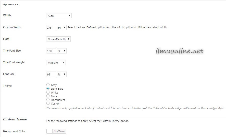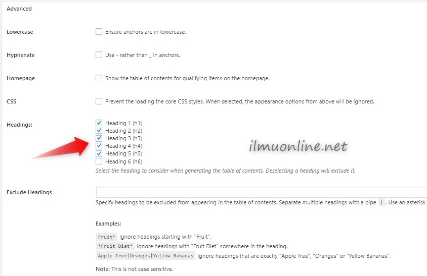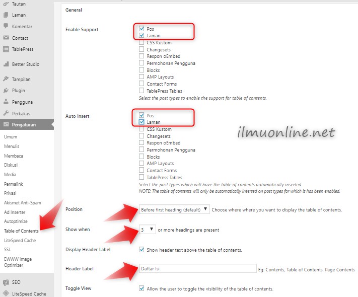 Adapun untuk mensetting plugin easy table of contents, saya biasanya menggunakan settingan yang seperti ini :