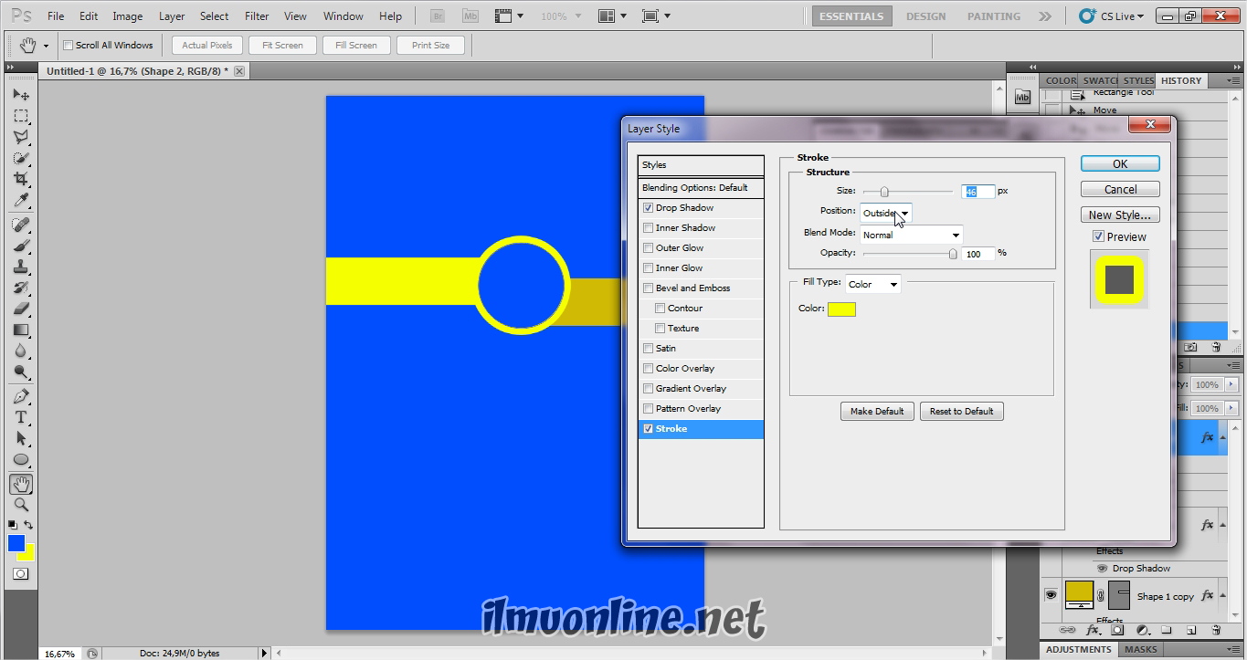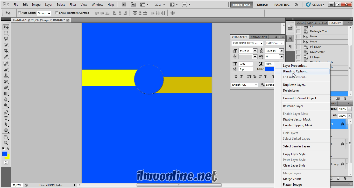 Atur agar warnanya menjadi biru, kemudian tarik sambil menekan tombolm”SHIFT” agar lingkaran menjadi proposional. Setelah itu, klik kanan pada layer lingkaran di panel layer, kemudian pilih “Blending Options”.