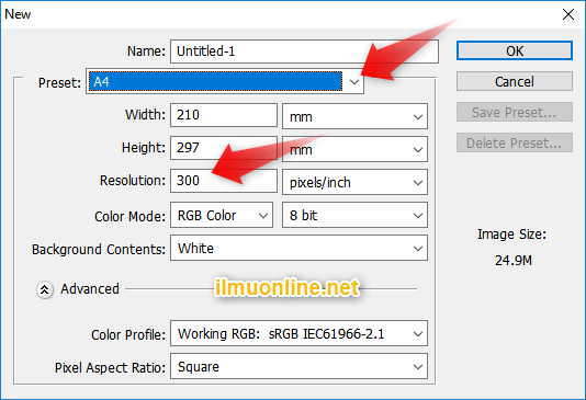 - Kemudian klik File >> New atau CTRL+N melalui keyboard untuk menyiapkan ukuran kertas yang ingin anda cetak, semisal media cetak ukuran A4, maka pada bagian Preset pilih A4 dan perlu anda ingat pada bagian Resolution, semisal Resolution: 300 px dan klik OK.