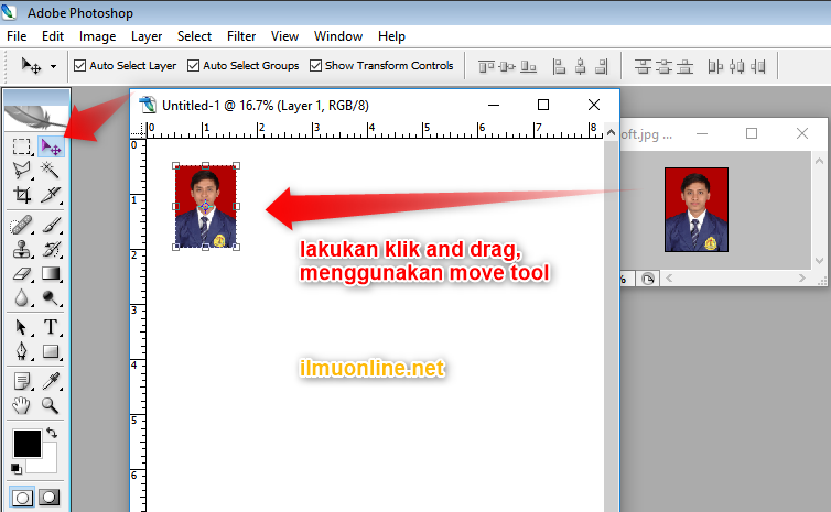 - Selanjutnya, letakkan file foto yang barusan di crop menjadi 3X4 ke dalam dokumen baru A4, caranya dengan klik Move Tool lalu klik and drag ke dokumen yang baru. Seperti contoh dibawah ini
