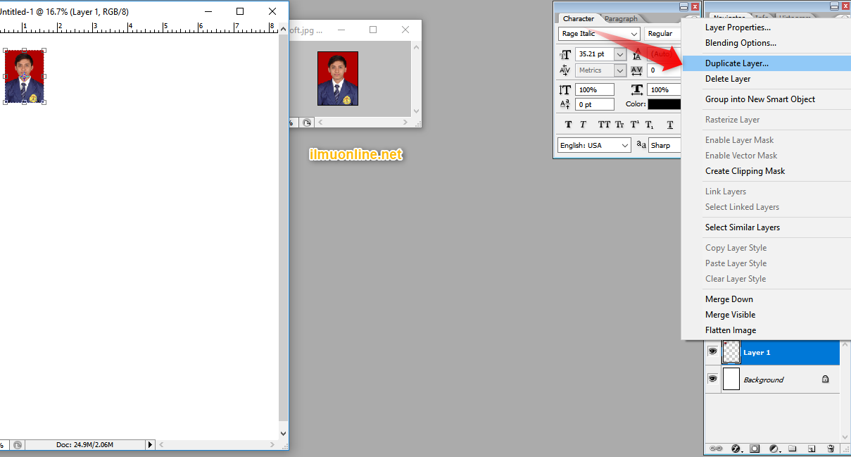 - Langkah selanjutnya ialah menggandakan ukuran foto 3X4 sebanyak yang anda inginkan. Cara menggandakan layar foto caranya cukup mudah, yakni klik fotonya lalu klik tombol Alt pada keyboard dan geser foto di sebelah kiri atau bawah dari foto sebelumnya. cara menggandakan foto lainnya ialah dengan Duplicate layer, atau klik CTRL+J pada keyboard laptop/komputer anda.