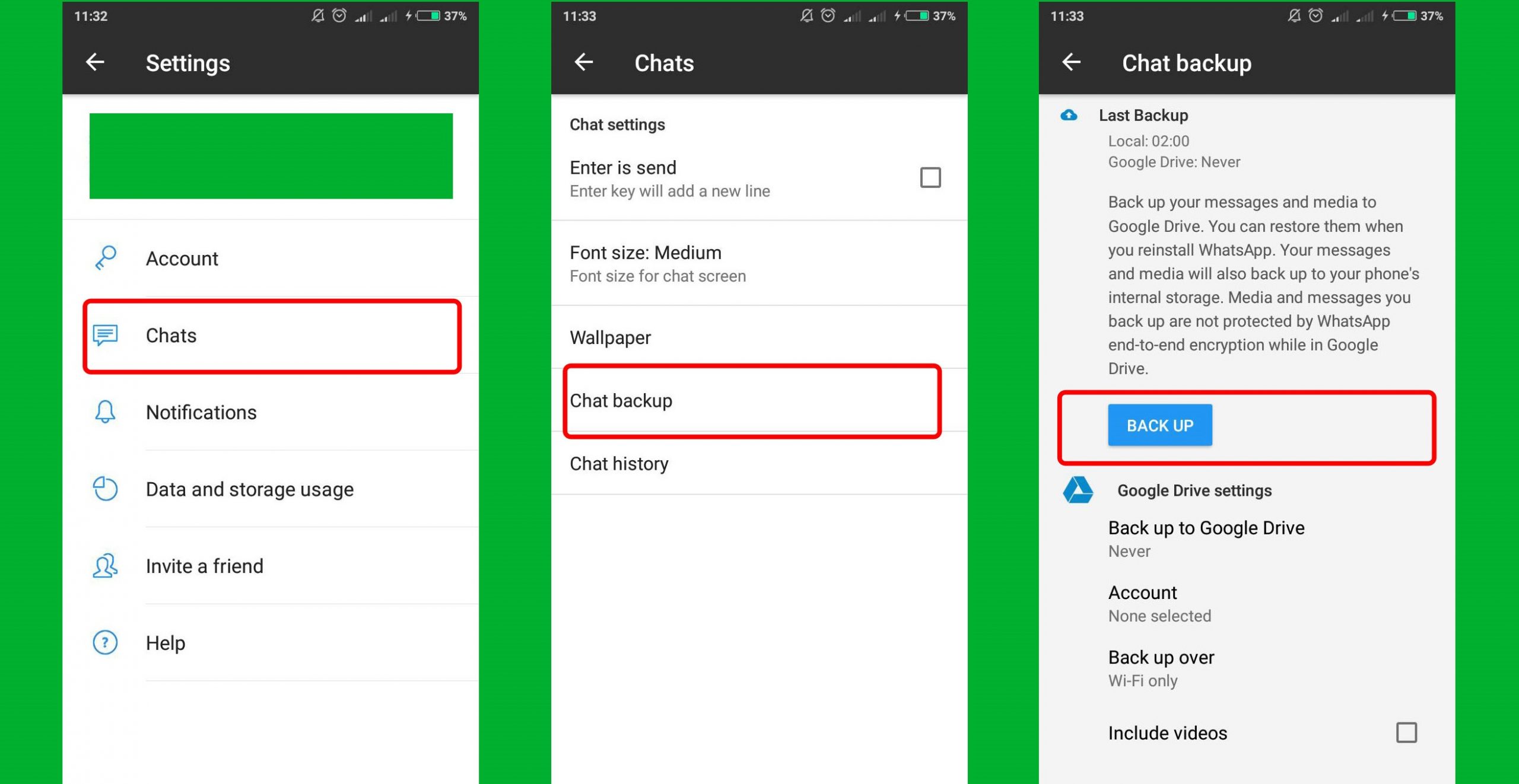 Lalu tap pada pilihan Chats > Chat Backup > BACK UP