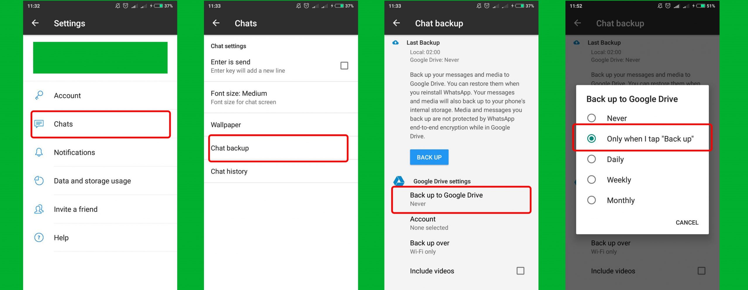 Kemudian tap pada pilihan Chats > Chat Backup > Back up to Google drive > Only when I tap “Back up”