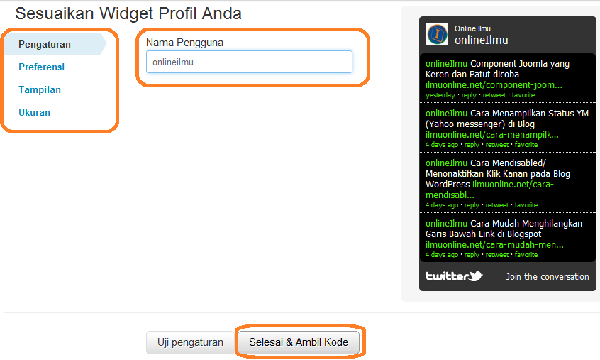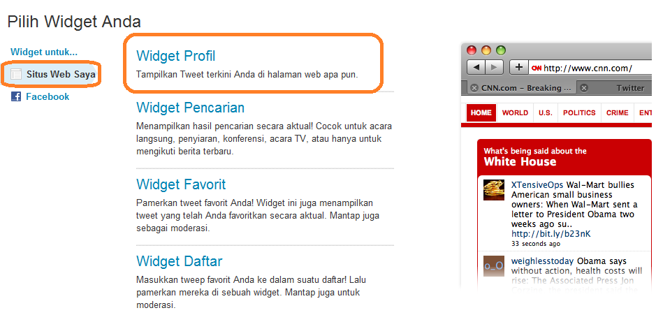 - Silahkan berkunjung ke http://twitter.com/goodies/widgets untuk menambahkan widget pilih menu My Website / Situs Web Saya