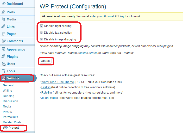 - Kemudian silahkan pilih Menu Settings >> WP-Protect, pada WP-Protect Configurations silahkan kasih centang pada 3 pilihan ; Disable Right Clicking, Disable text Selection, dan Disable image dragging. dan pilih Update untuk mengupdate konfigurasi WP-Protect
