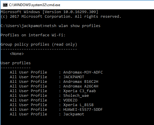 - Setelah tab CMD terbuka ketikkan “ netsh wlan show profiles “ pada baris CMD dan klik enter, maka akan muncul daftar wifi yang sudah pernah terhubung dengan laptop atau PC Anda.