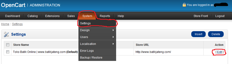 3. Setelah di Upload, selanjutnya kita masuk ke halaman Administrator Opencart, yang biasanya kalau di localhost ya http://localhost/namadomain/admin trus pilih menu System >> Setting. pada Store Name setting, klik Edit