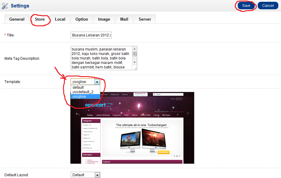 4. Karena kita mau mengubah /mengganti template, pilih Tab menu Store dan pada bagian Template silahkan pilih nama template yang barusan sobat upload.