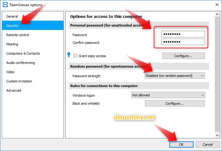 - Kemudian pada bagian menu Security, Disisi sebelah kanan silahkan isikan password dan confirm password yang akan kalian gunakan untuk teamviewer di laptop atau komputer kalian, serta pada bagian Password strength pilih menjadi Disabled (no random password)