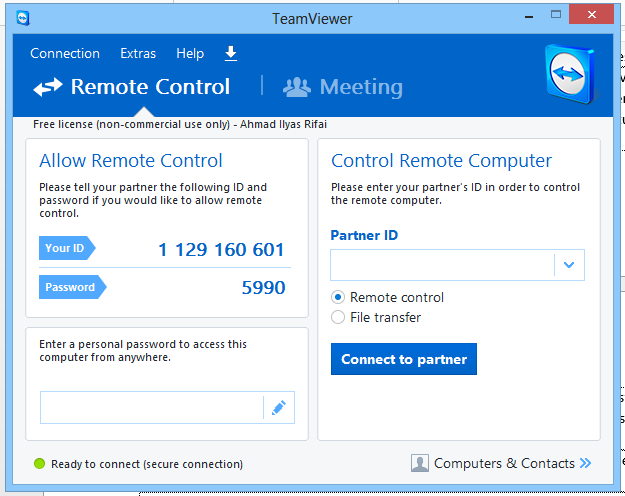 - Untuk melakukan koneksi ke komputer lain, harap masukkan partner id komputer lain di input bar sebelah kanan, kemudian klik connect to partner