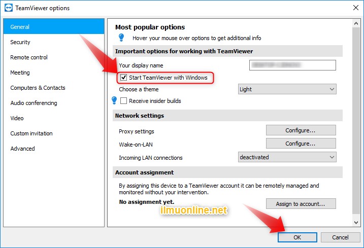 - Pada bagian General, pada jendela sebelah kanan checklist / centang pada Start TeamViewer with Windows, yang artinya aplikasi TeamViewer kalian akan aktif dengan sendirinya ketika laptop atau komputer kalian dinyalakan.
