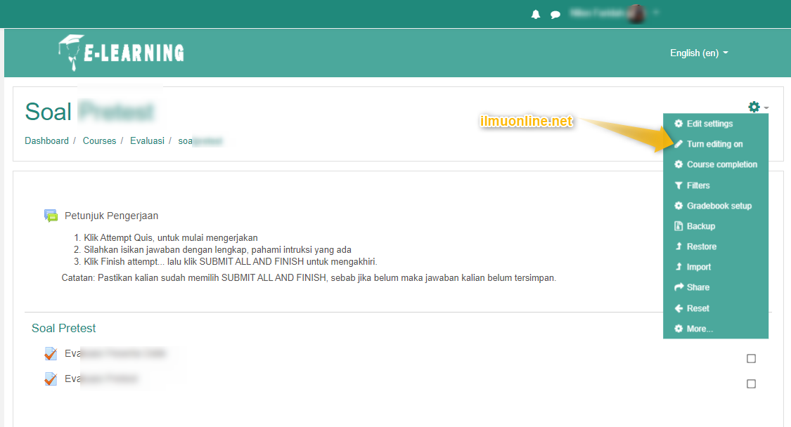- Pada bagian kanan atas, pilih tanda gerigi lalu klik kiri dan pilih Turn editing on, seperti ini