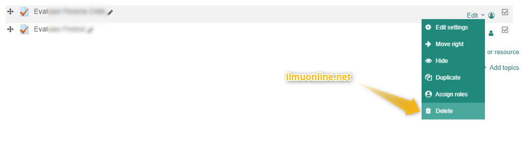 - Lalu pada sisi kanan course klik Edit, maka ada pilihan edit setting(mengedit course), hide (menyembunyikan course), dupilcate (menggandakan course), delete (menghapus course). Karena dalam contoh kali ini kita mau menghapus course maka silahkan pilih Delete, seperti ini.