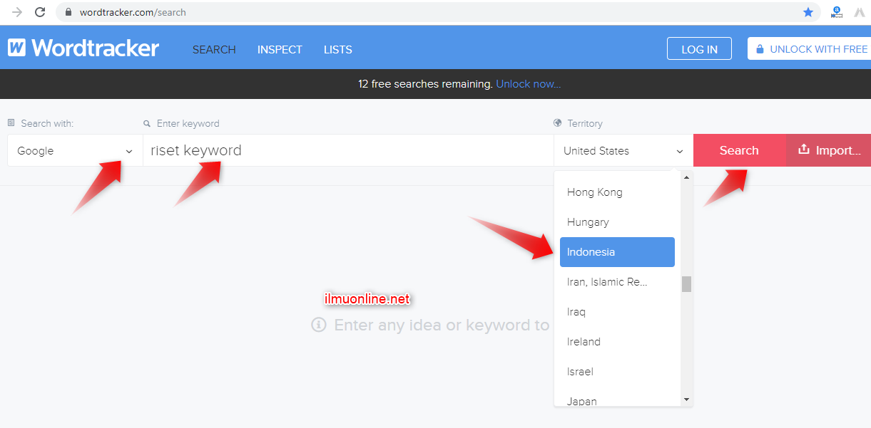 - Pada bagian Search With, pilih Google jika ingin riset keyword di blog, atau pilih Youtube jika ingin riset keyword youtube. Isikan keyword yang akan kalian cari pada kolom Enter keyword. Serta pada kolom Territory isikan wilayah yang anda cari, misalkan pilih Indonesia jika kalian ingin riset untuk blog indonesia.
