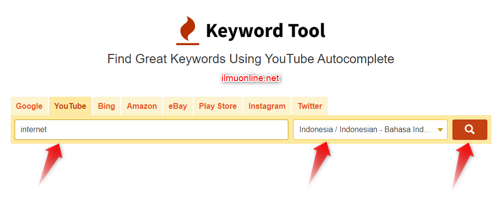 Cara riset keyword youtube dan untuk blog lainnya ialah dengan menggunakan keywordtool.io, sesuai namanya ya tool ini bisa kalian gunakan untuk kegiatan mencari keyword ideal untuk kebutuhan video youtube, maupun konten blog. Adapun cara menggunakannya adalah sebagai berikut: