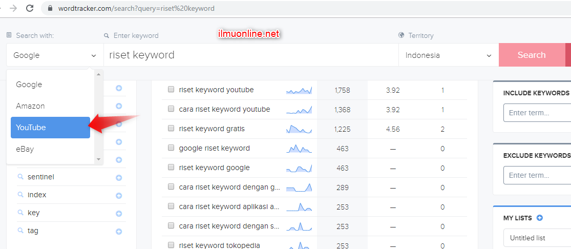 Adapun cara riset keyword youtube caranya masih sama dengan cara diatas, kalian tinggal mengganti di kolom Search with dengan Youtube. Seperti gambar yang terlihat dibawah ini