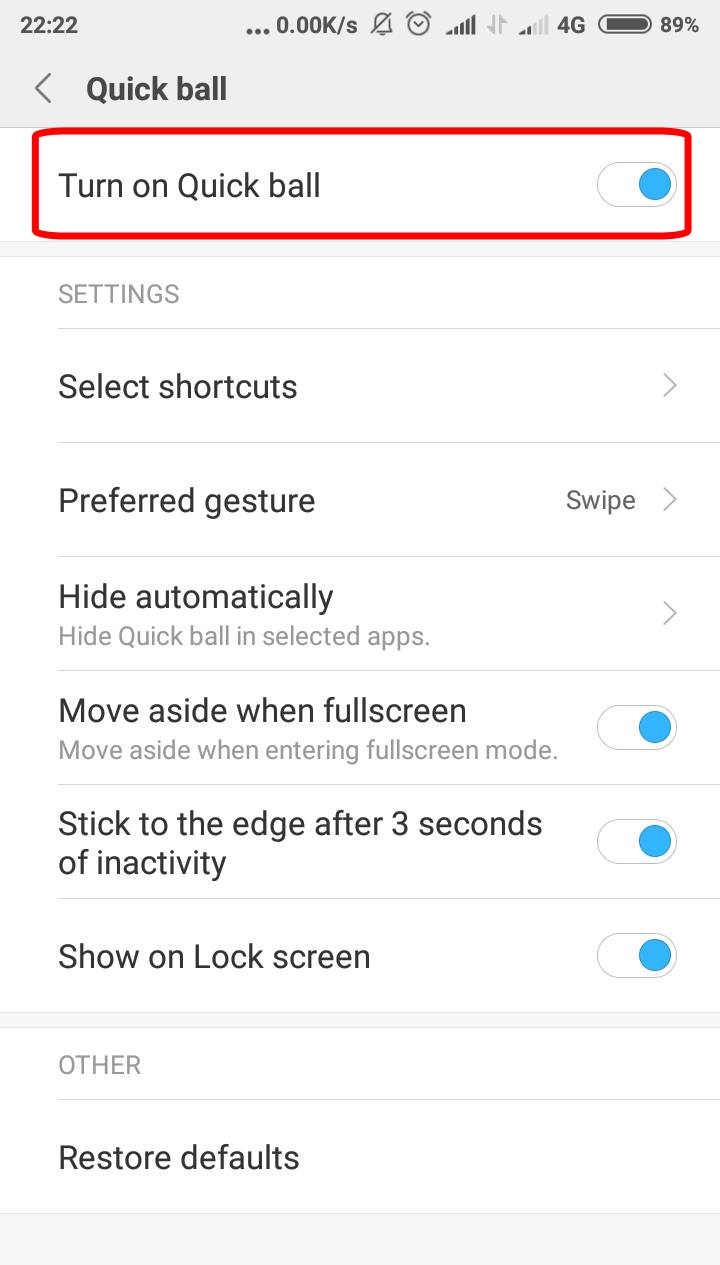 Cara yang satu ini adalah mengambil screenshot dengan quickball. Quickball adalah bola pintas yang memudahkan kita dalam menggunakan smarphone. Quickball ini terdiri atas beberapa pilihan yang bisa kamu atur sendiri sesuai kebutuhan. Umumnya quickball terdiri dari pilihan Home, Menu, Lock screen, Screenshot dan Back. Sebelum mengambil screenshot dengan quickball, pertama-tama kamu harus mengaktifkan quickball terlebih dahulu. Caranya masuk pada Setting > Additional Setting > Quick Ball > kemudian Turn on Quick ball.