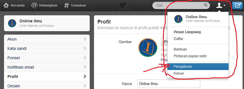 1. Silahkan masuk ke account twitternya ya, kemudian klik menu Pengaturan/Setting di kanan atas.