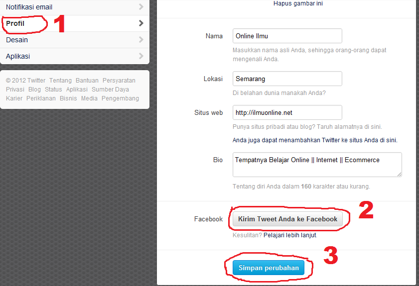 2. di halaman berikutnya pilih menu Profil, di kanan bawah pada bagian Facebook klik tombol Kirim Tweet Anda ke Facebook (pastikan facebooknya sobat dah aktif/masuk ya, klo belum silahkan login dulu di account facebooknya)