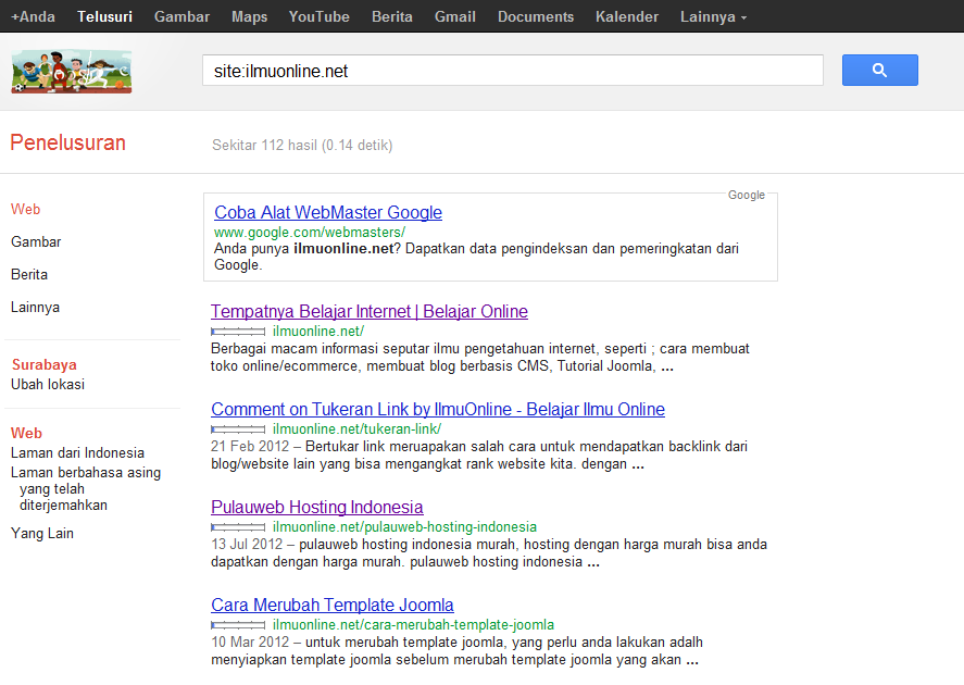 – Silahkan Masuk ke www.google.com, kemudian search seperti biasa dengan mengetikkan ‘site:alamatbloganda‘ tanpa tanda ‘ (petik). serta alamamatblog.com Anda ganti dengan URL alamat dari blog Anda