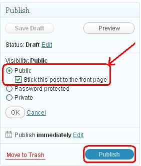 - Kasih tanda centang pada Stick this post to the front page, kalau sudah klik OK dan Publish.