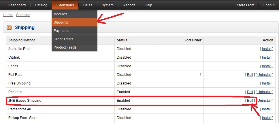 - Kemudian kembali ke menu Extensions -> Shipping -> JNE Based Shipping klik Edit.