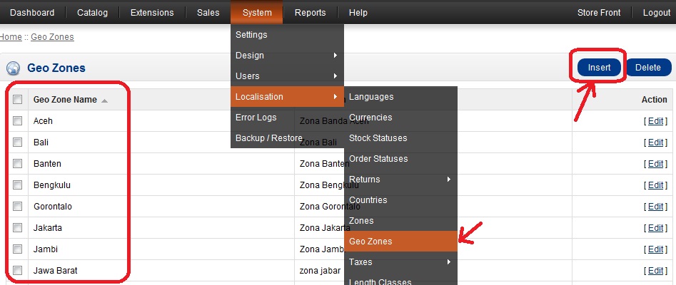 - kemudian Login Admin. Masuk ke Extensions->Shipping kemudian install JNE Based Shipping. jika sudah terinstall Tambahkan GeoZone per propinsi dengan cara System ->Localisation -> GeoZones klik Insert