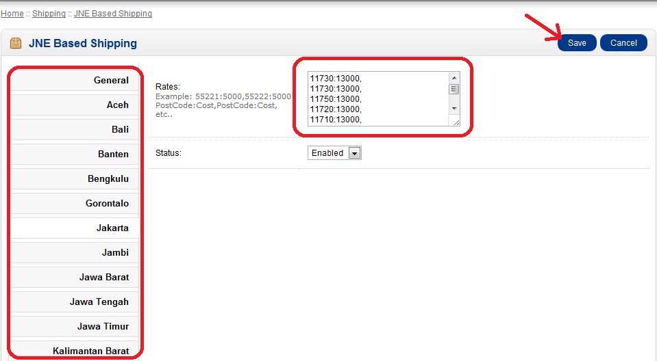 - kemudian copykan tarif untuk tiap GeoZones. dengan format “kodepos:tarif” tanpa tanda “” misal 50111:24000,50000:24000
