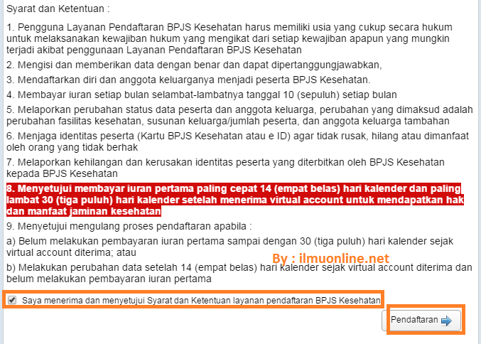 - Menyetujui membayar iuran pertama paling cepat 14 (empat belas) hari kalender dan paling lambat 30 (tiga puluh) hari kalender setelah menerima virtual account untuk mendapatkan hak dan manfaat jaminan kesehatan