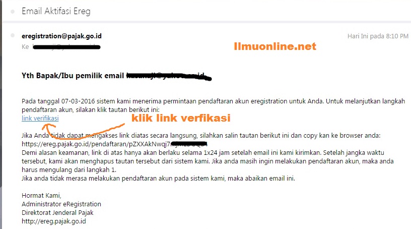 - Selanjutnya silahkan masuk ke email yang anda ketikkan tadi, dan cek inbox / kota masuk dengan judul “Aktifasi Ereg” lalu buka pesan tersebut dan klik pada bagian “link verifikasi“