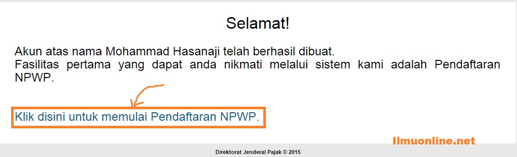 - Maka akan muncul pesan aktifasi berhasil, selanjutnya klik pesan “klik disini untuk memulai Pendaftaran NPWP“