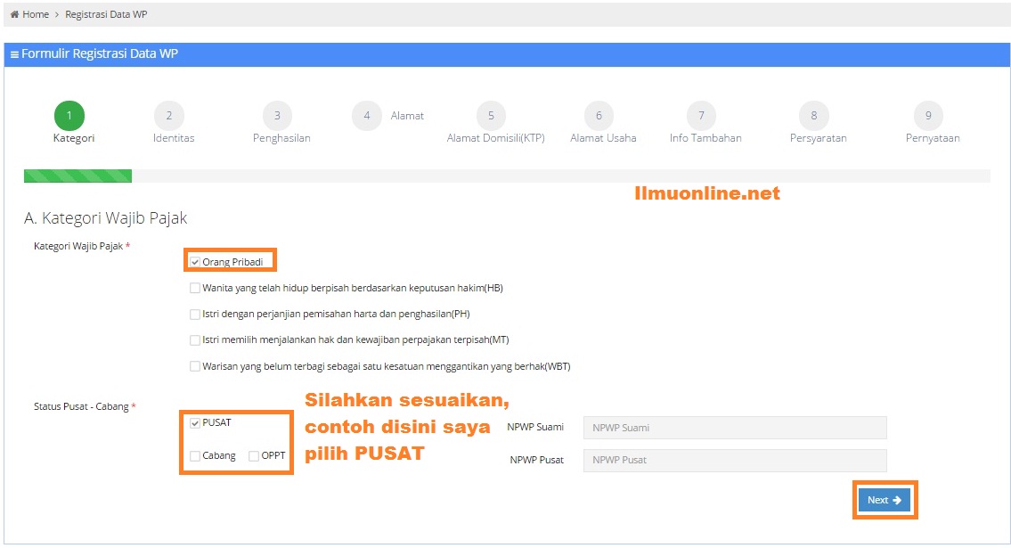 - Selanjutnya pada Kategori Wajib Pajak silahkan pilih “Orang Pribadi” karena kita mau membuat NPWP Pribadi, lalu pada pilihan status Pusat – Cabang terserah anda mau pilih kantor pajak pusat daerah atau cabang daerah, lalu klik tombol Next untuk melanjutkan ke proses selanjutnya.