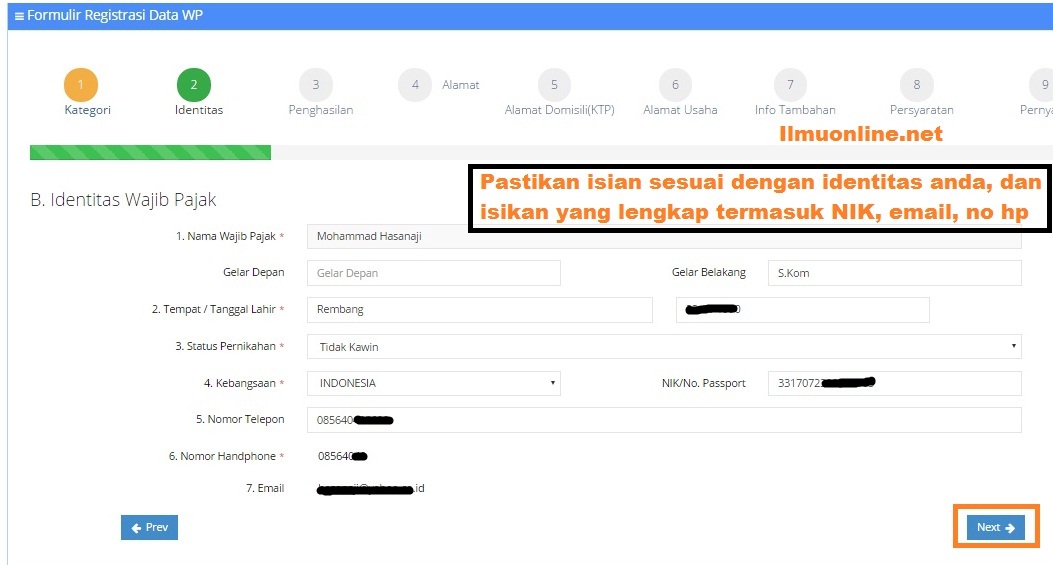 - Lalu pada form identitas silahkan isikan isikan identitas anda secara lengkap dan benar, lalu klik tombol Next. contoh seperti gambar dibawah