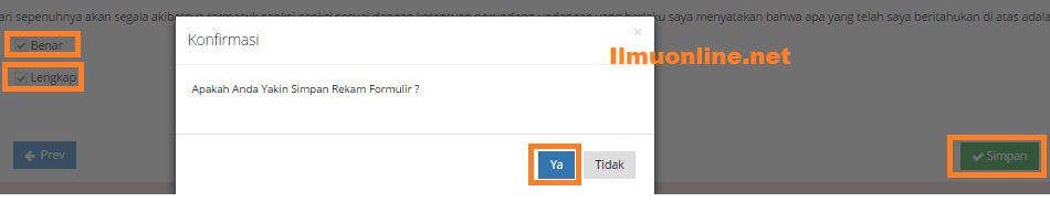 - Jika sudah kini saatnya untuk tahap akhir, cek ulang data yang sudha Anda isikan dan jika sudah mantep benar maka anda tinggal memilih/menchecklist pilihan Benar dan Lengkap lalu klik tombol Simpan lalu pilih Ya.