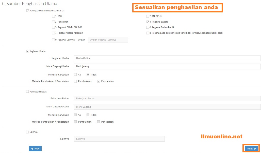 - Pada form penghasilan isikan sesuai dengan sumber penghasilan Anda, jika ada usaha sampingan juga silahkan di isikan selain penghasilan utama.