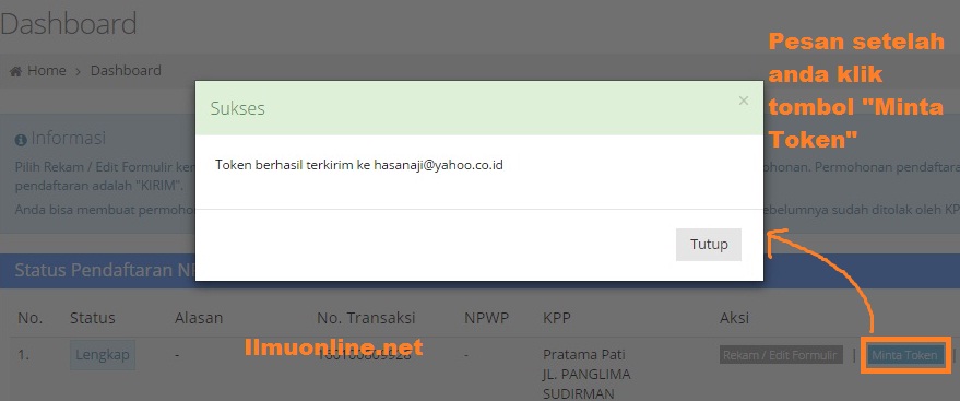 - Sampai sini proses pengisian form pendaftaran NPWP Anda selesai. Selanjutnya anda pilih menu Dasboard, lalu klik tombol Minta Token, jika berhasil akan muncul pesan seperti berikut