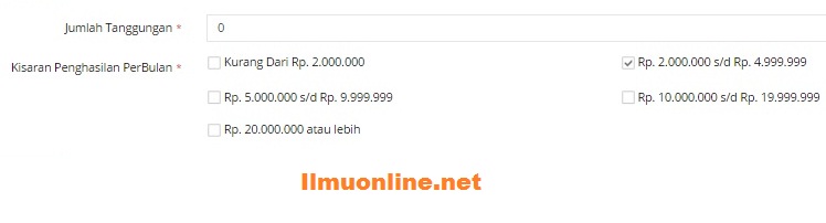- Untuk form Info Tambahan, silahkan isikan jumlah tanggungan anda misal jika sudah menikah, serta kisaran penghasilan anda per bulannya . Misal karena saya berstatus belum menikah saya isikan nol “0” pada kolom Tanggungan