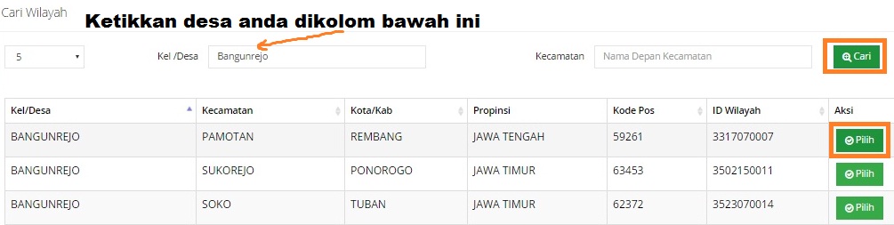 - Kemudian dilanjutkan pengisian alamat sesuai KTP anda, penting untuk pengisian alamat klik tombol cari “loop” lalu ketikkan nama kelurahan/desa anda, maka akan tampil beberapa desa yang mempunyai nama yang sama. Tugas anda ialah memilih “klik tombol Pilih” sesuai alamat desa KTP anda agar form dibawahnya “nama desa, kec, kab, prov terisi otomatis” lalu isikan nomor hp dan telepon anda yang masih aktif. klik tombol Next untuk proses melanjutkan