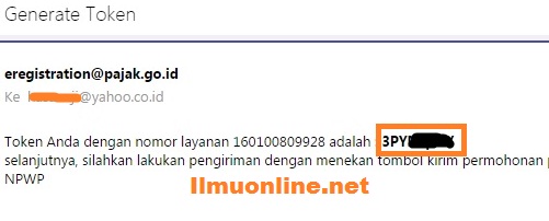 - Cek kotak masuk/inbox Email anda, disitu anda akan mendapatkan detail token NPWP anda. Untuk menggunakannya silahkan copy teken yang anda terima tadi.