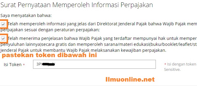- Maka akan muncul pesan Surat Pernyataan, anda checklist semua pilihan lalu pada form Isi token pastekan Teken yang sudah anda peroleh di email tadi ke kolom isi token. lalu klik tombol Simpan.