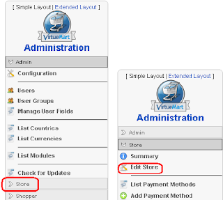 Langkah kedua : klik store pada menu administrator di sebelah kiri, kemudian klik Edit Store atau klik gambar Edit Store pada halaman depan Control Panel Virtuemart.