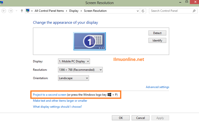 Pada pilihan screen resolution pilih Project to a second screen, seperti gambar dibawah