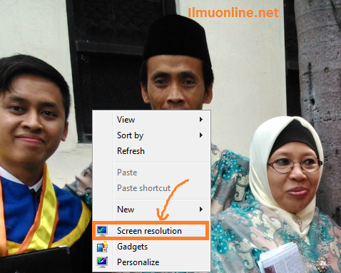 Pada keyboard, klik tombol Windows (gambar jendela) + P secara bersamaan, atau melalui perintah Klik kanan pada desktop lalu pilih Screen resolution.